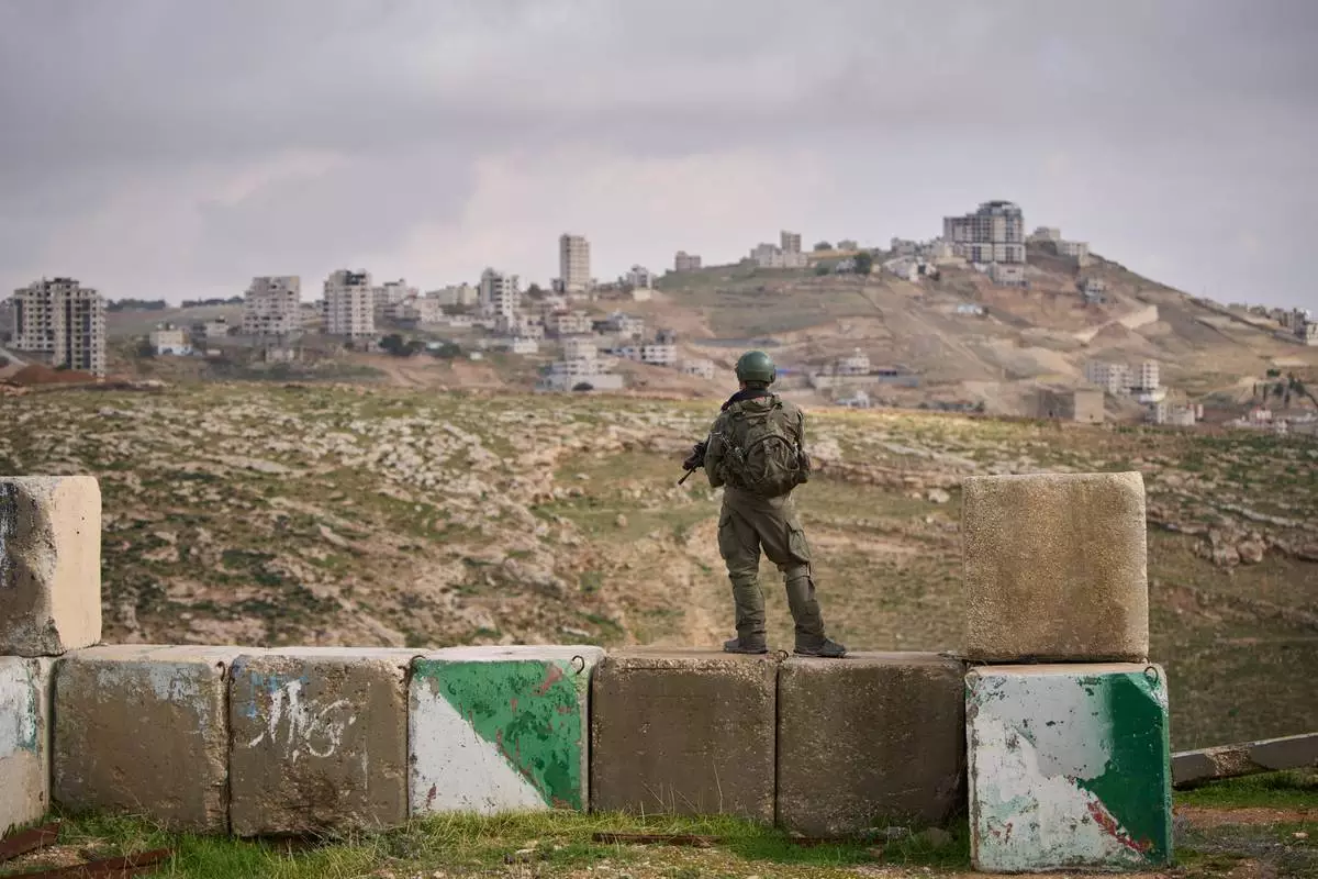 An Israeli soldier stands guard during the inauguration ceremony for the newly legalized Jewish settlement of Yatziv, near the Palestinian town of Beit Sahour, in the West Bank, Jan. 19, 2026. (AP Photo/Ohad Zwigenberg)