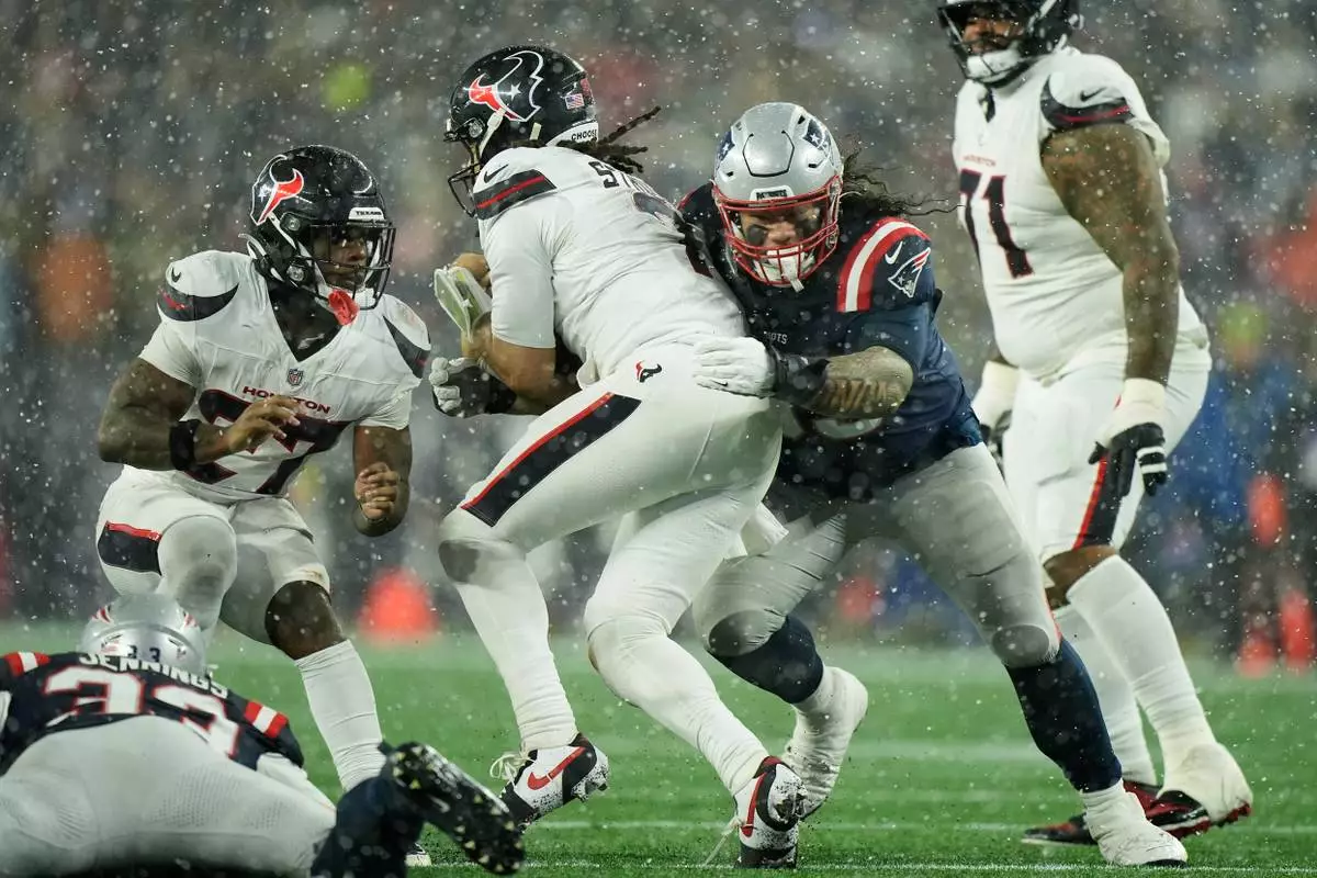 On a cold afternoon that mixed rain and wet snow, Houston's top-ranked defense hassled Drake Maye all game, forcing four fumbles (recovering two) and sacking him five times. The MVP contender finished 16 for 27 for 179 yards, but he also threw for three touchdowns.