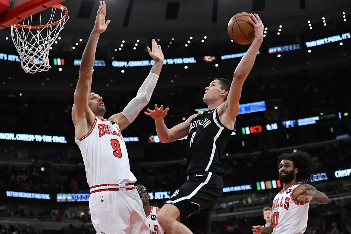 Brooklyn Nets' Egor Demin (8) goes up for a shot against Chicago Bulls' Nikola Vucevic (9) during the first half of an NBA basketball game Sunday, Jan. 18, 2026, in Chicago. (AP Photo/Paul Beaty)