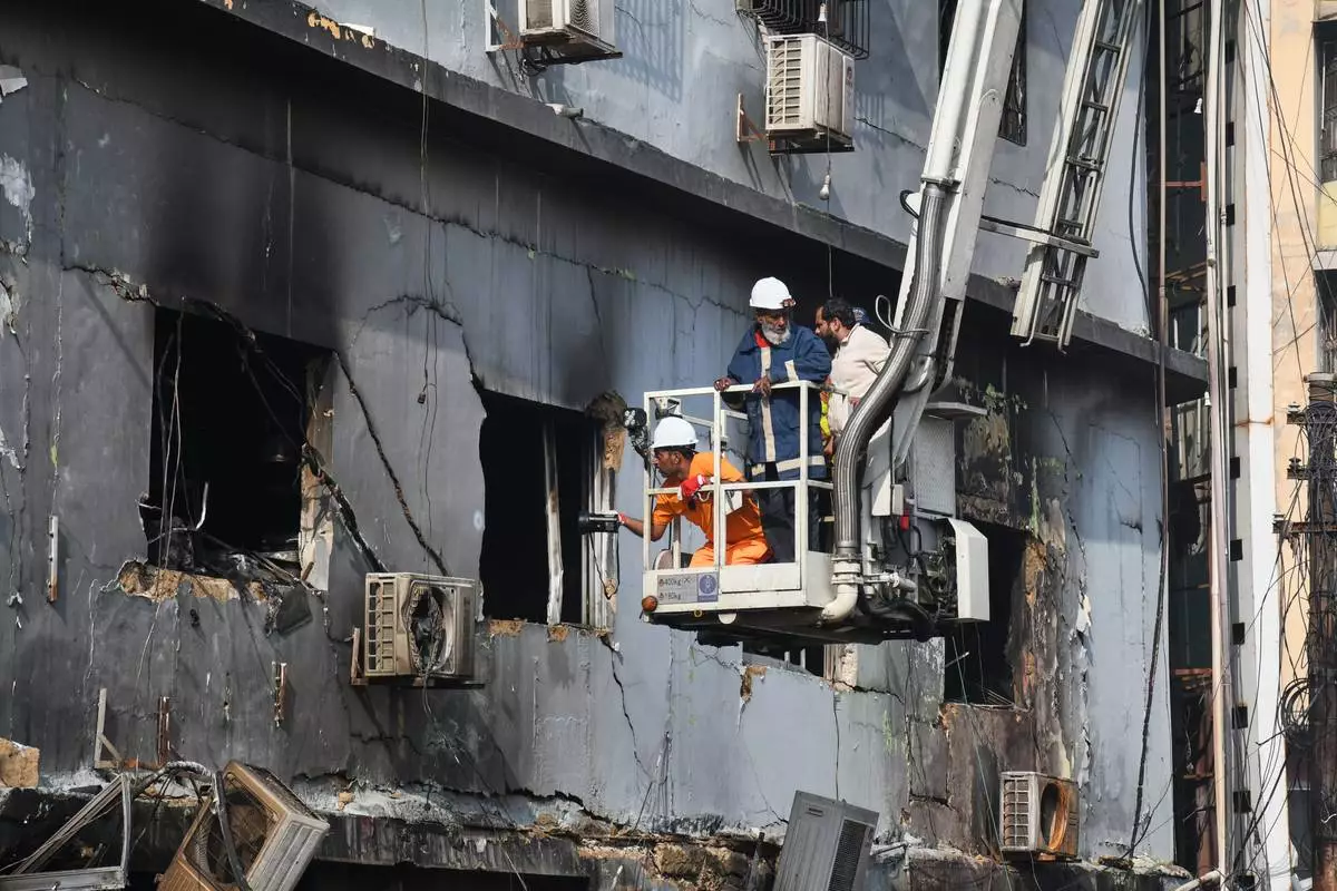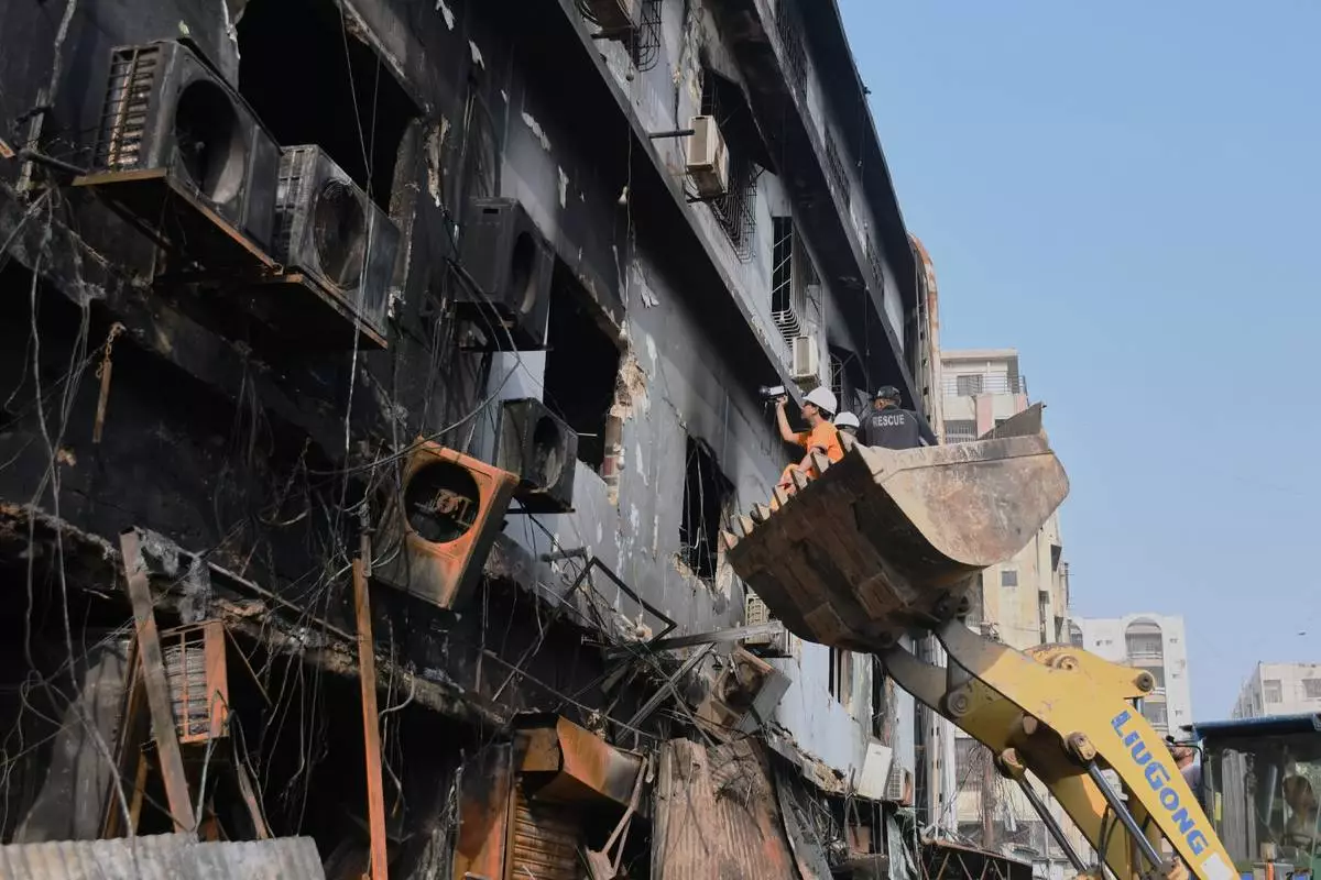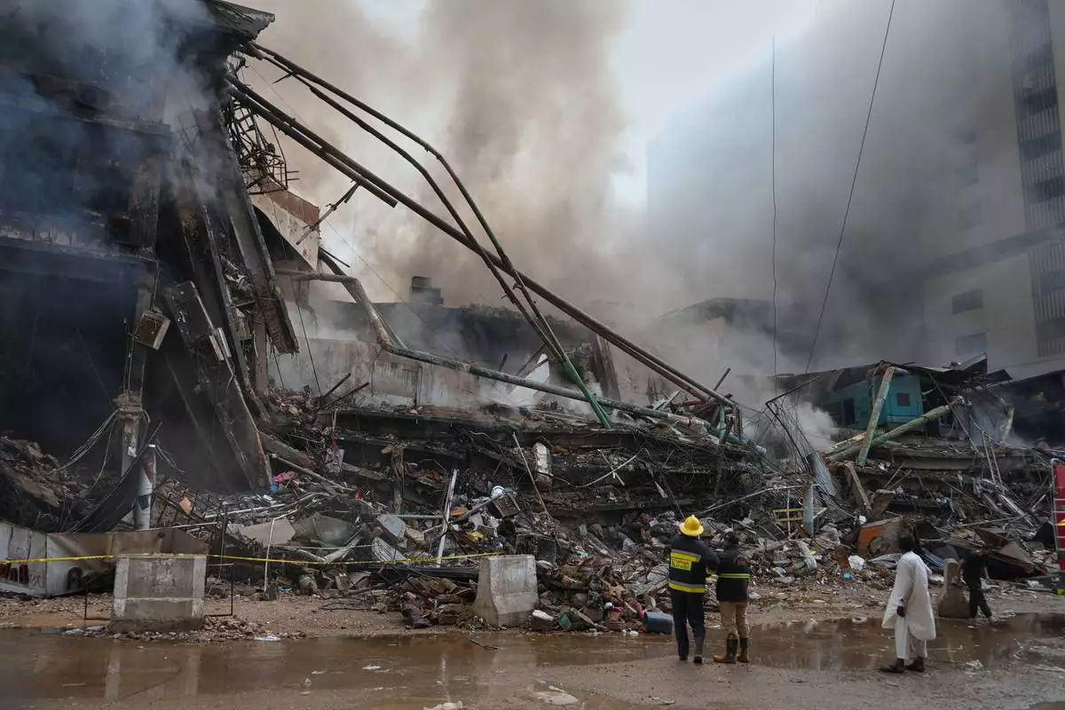Firefighters examine a collapsed portion of a multi-story shopping mall following a massive fire that broke out overnight, in Karachi, Pakistan, Sunday, Jan. 18, 2026. (AP Photo/Mohammad Farooq)