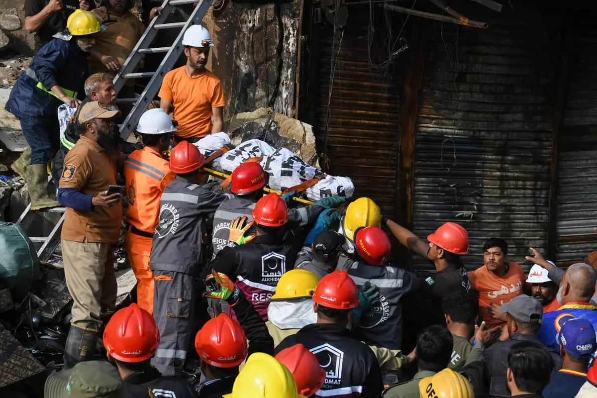 Firefighters carry remains of the victims after recovering from the rubble of a burnt building of a multi-story shopping plaza following a massive fire in Karachi, Pakistan, Monday, Jan. 19, 2026. (AP Photo/Ali Raza)