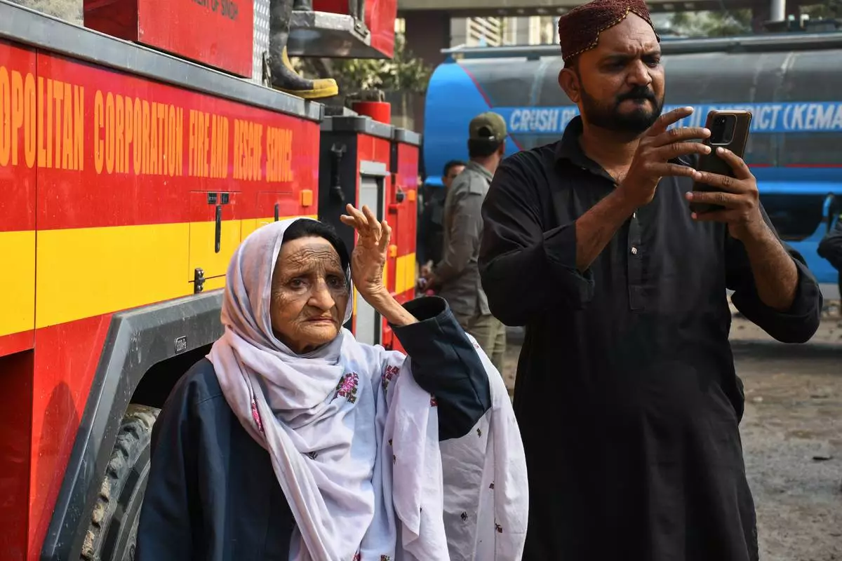 A family member of a missing person waits near the site of a burnt building of a multistory shopping plaza following a massive fire in Karachi, Pakistan, Monday, Jan. 19, 2026. (AP Photo/Ali Raza)