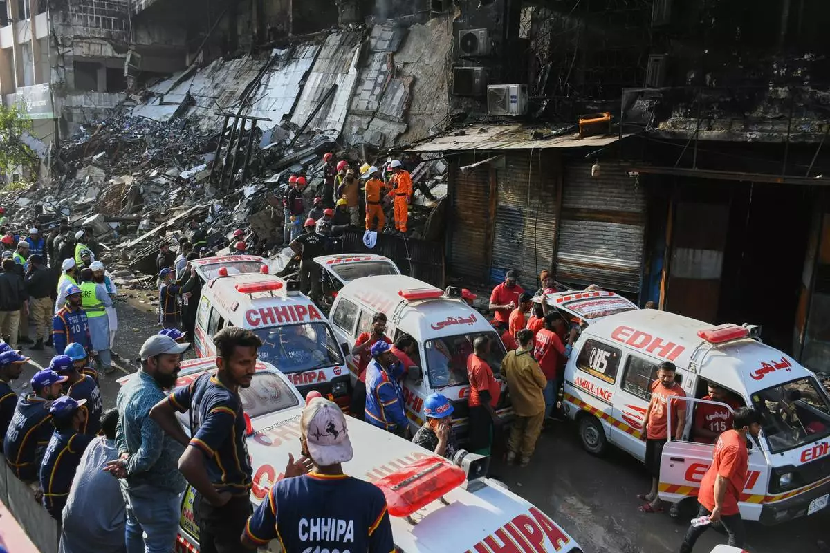 Ambulances are parked as rescue workers and firefighters work to search victims at the site of a burnt building of a multi-story shopping plaza following a massive fire in Karachi, Pakistan, Monday, Jan. 19, 2026. (AP Photo/Ali Raza)