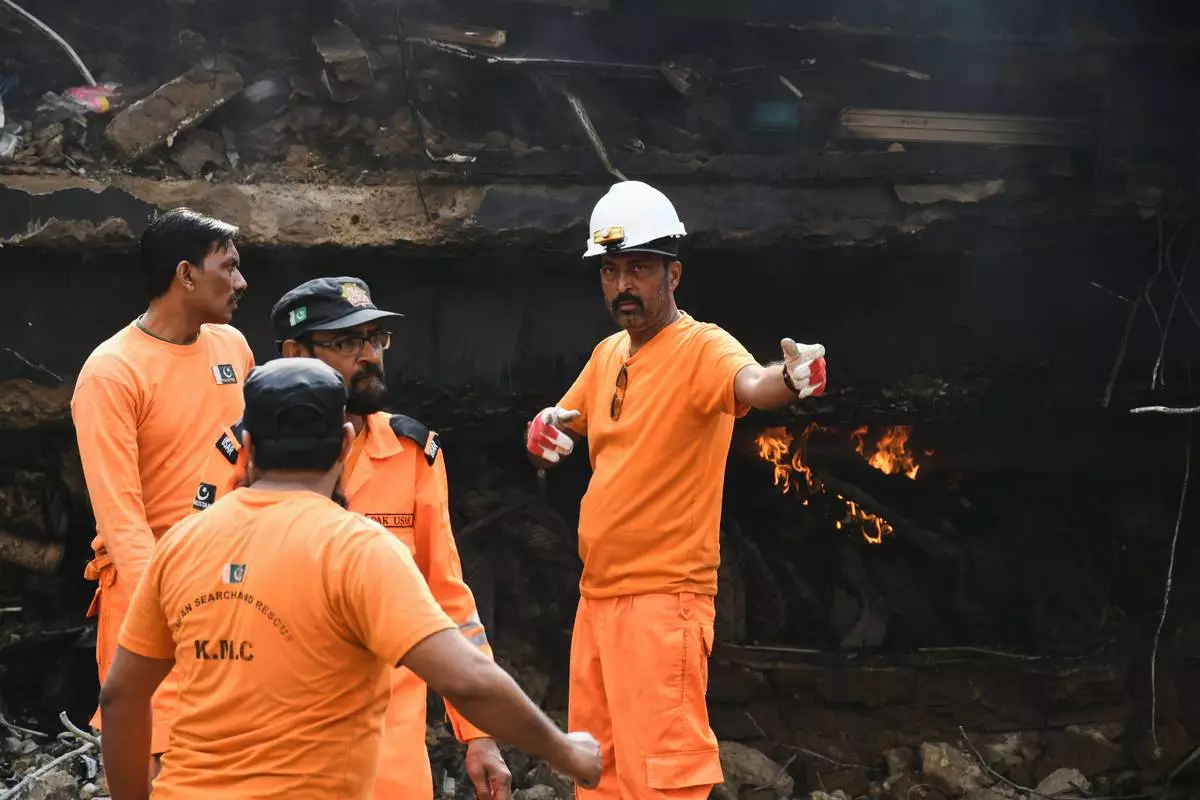 Firefighters search through the rubble of a burnt building of a multistory shopping plaza following a massive fire in Karachi, Pakistan, Monday, Jan. 19, 2026. (AP Photo/Ali Raza)
