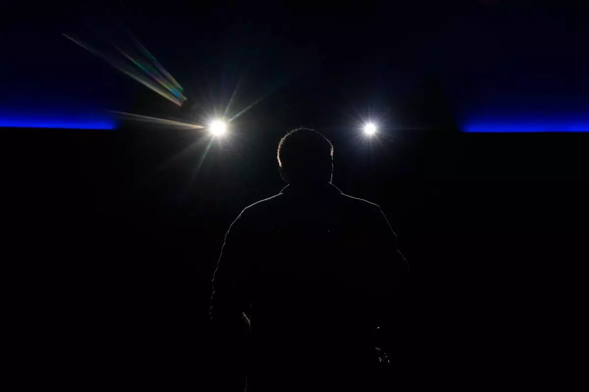 Theater technician Cody Gerken is rimmed by projector light as he introduces the "Ohio: Wild at Heart" film that features the state's top-rated park system to highlight wildlife conservation efforts and the restorative power of outdoor recreation at the Robert D. Lindner Family OMNIMAX Theater at the Cincinnati Union Terminal, Tuesday, Dec. 30, 2025, in Cincinnati. (AP Photo/Carolyn Kaster)
