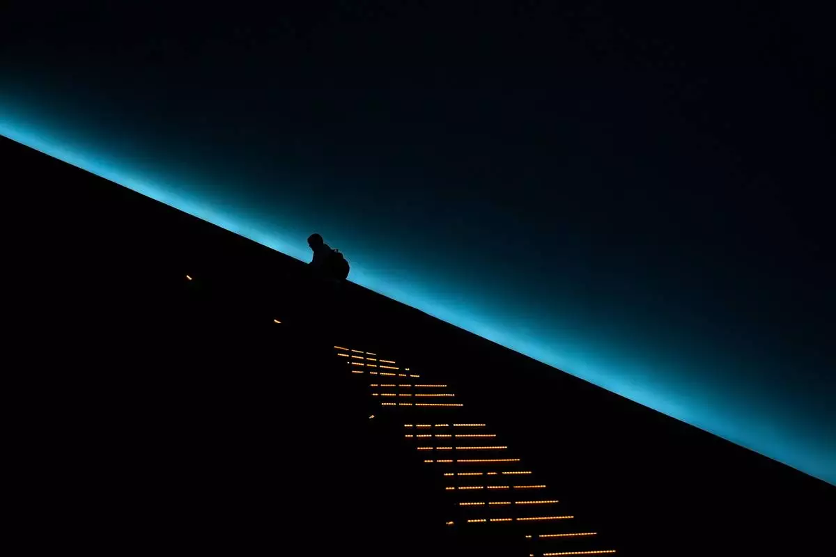 A patron climbs to their seat before a viewing of "Ohio: Wild at Heart" film that features the state's top-rated park system to highlight wildlife conservation efforts and the restorative power of outdoor recreation at the Robert D. Lindner Family OMNIMAX Theater at the Cincinnati Union Terminal, Tuesday, Dec. 30, 2025, in Cincinnati. (AP Photo/Carolyn Kaster)