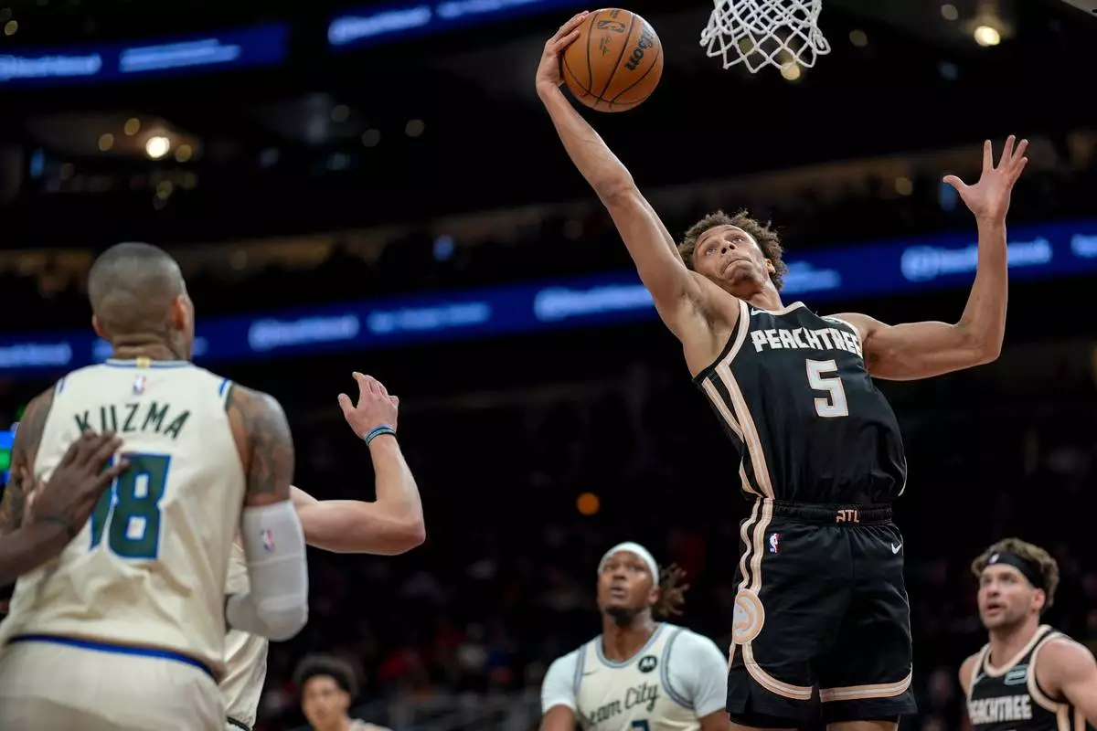 Atlanta Hawks guard Dyson Daniels (5) shoots against the Milwaukee Bucks during the first half of an NBA basketball game, Monday, Jan. 19, 2026, in Atlanta. (AP Photo/Mike Stewart)