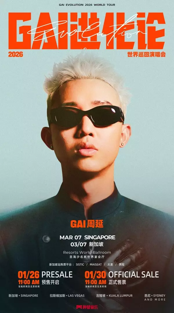 The tour kicks off in Singapore on March 7. Ticket presale begins at 11:00 AM on January 26 (local time and Beijing time), with official sales starting at 11:00 AM on January 30 (local time and Beijing time). Ticketing platforms for the Singapore stop include SISTIC, MAISEAT, Damai, and Ctrip. The performance will be held at Resorts World Ballroom at Resorts World Sentosa. The Singapore debut will feature a special standing zone, allowing fans to experience the sonic bombardment at the closest distance, resonate in sync with the stage, and push the interactive proximity to its absolute limit. Subsequently, the GAI EVOLUTION WORLD TOUR will make its way to Las Vegas, Kuala Lumpur, Sydney, and other cities.