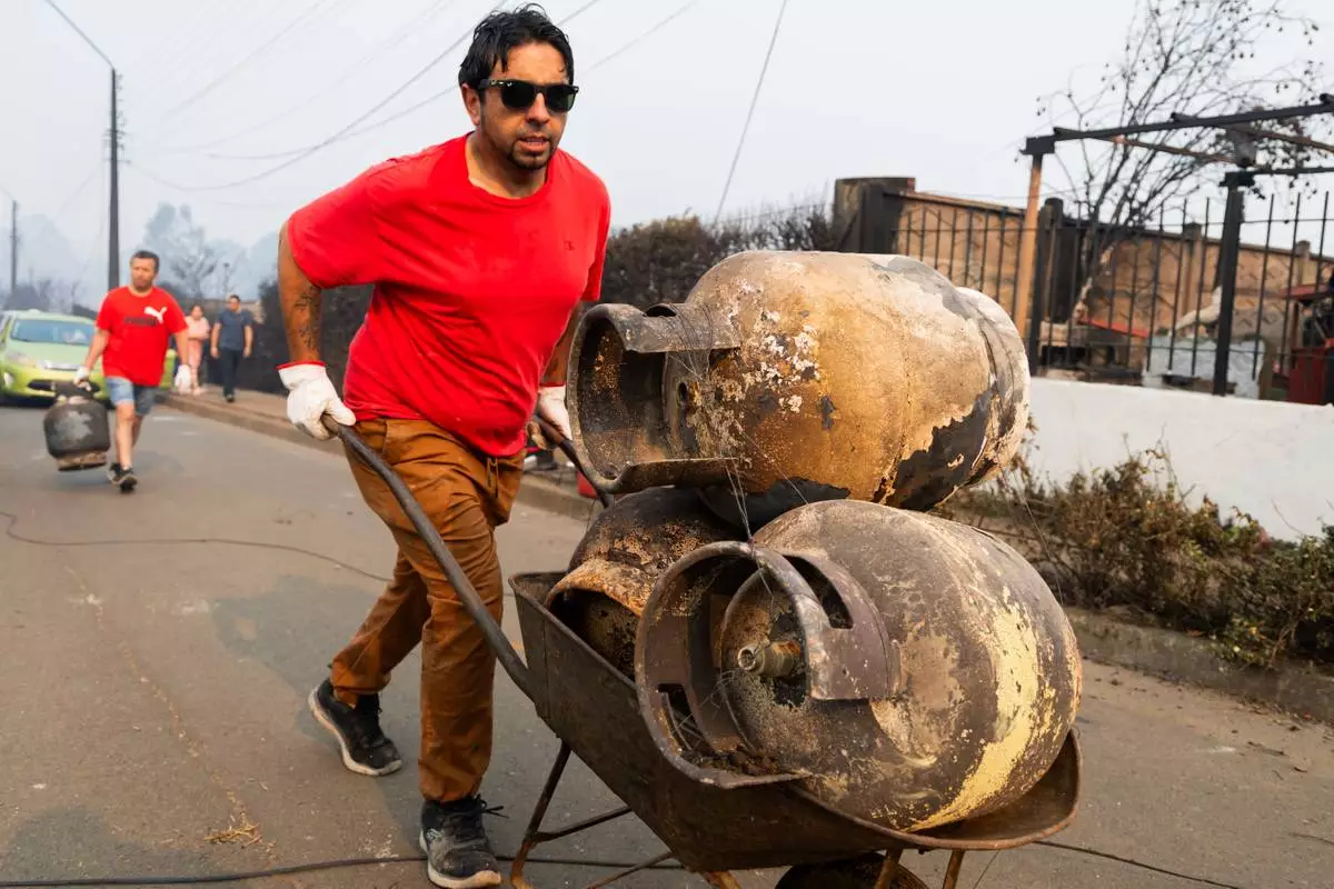 Resident Andres Garrido pushes a wheelbarrow with gas cylinders burned when wildfires destroyed homes in Tome, Chile, Monday, Jan. 19, 2026. (AP Photo/Javier Torres)