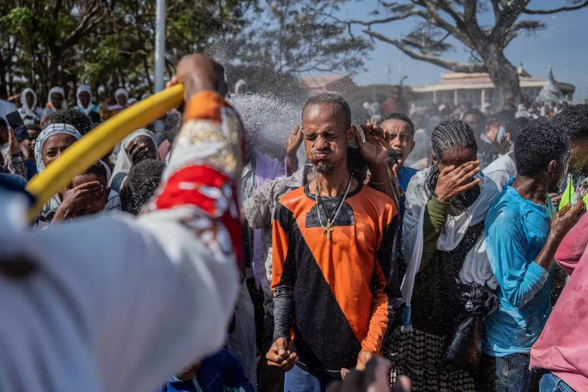 Holy water is sprayed on Ethiopian Orthodox worshippers, during the celebration of the Ethiopian Epiphany on lake Dembel, in Batu, Ethiopia, Monday, Jan. 19, 2026. (AP Photo/Amanuel Sileshi)