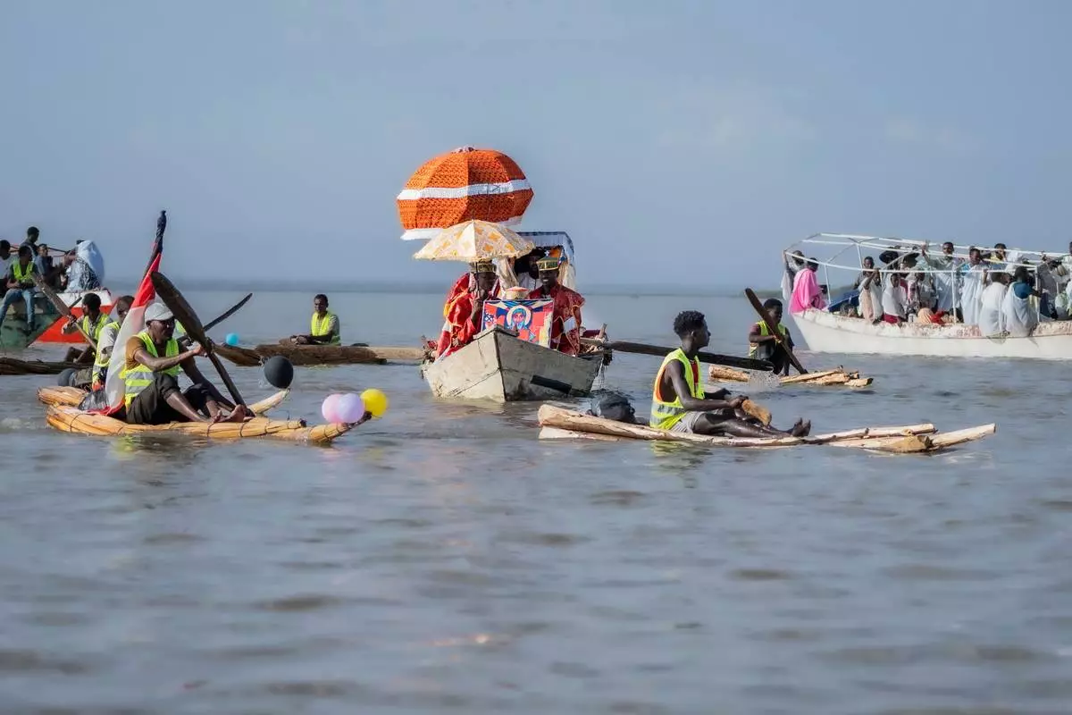 Ethiopian orthodox believers ride boats to celebrate Timket, the Ethiopian Epiphany, on lake Dembel, in Batu, Ethiopia, Sunday, Jan. 18, 2026. (AP Photo/Amanuel Sileshi)