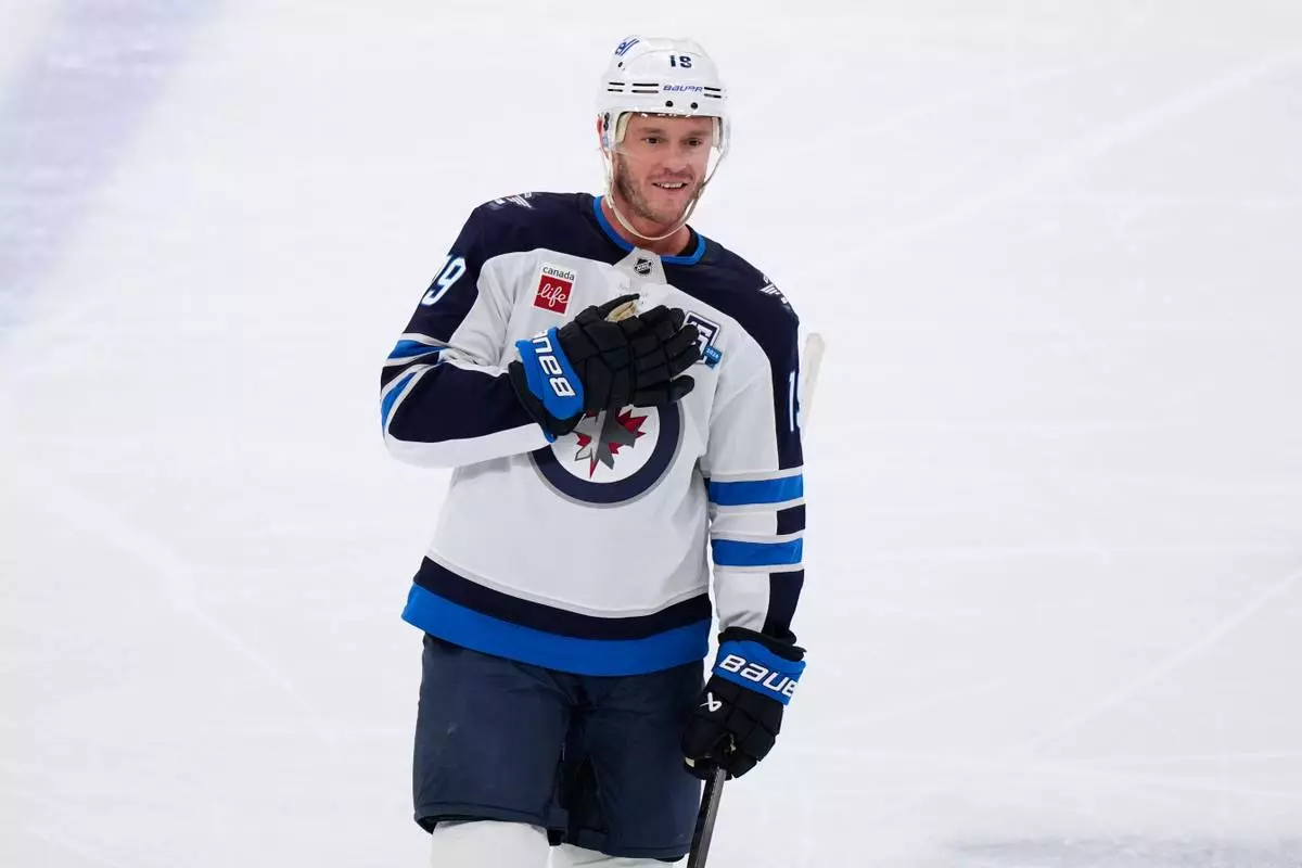 Winnipeg Jets center Jonathan Toews greets to the crowd during the first period of an NHL hockey game against the Chicago Blackhawks in Chicago, Monday, Jan. 19, 2026. (AP Photo/Nam Y. Huh)