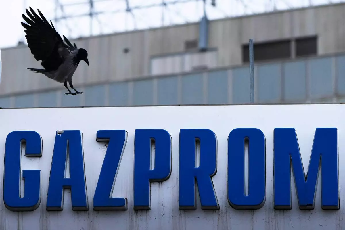 A raven flies over the Gazprom company logo at a petrol station in Belgrade, Serbia, Sunday, Nov. 23, 2025. (AP Photo/Darko Vojinovic)