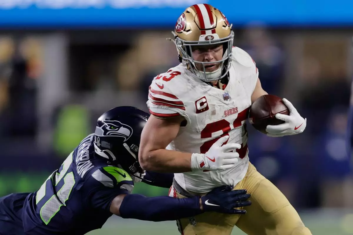 San Francisco 49ers running back Christian McCaffrey (23) tries to get past the Seattle Seahawks cornerback Devon Witherspoon during the first half of an NFL football divisional playoff game Saturday, Jan. 17, 2026, in Seattle. (AP Photo/John Froschauer)