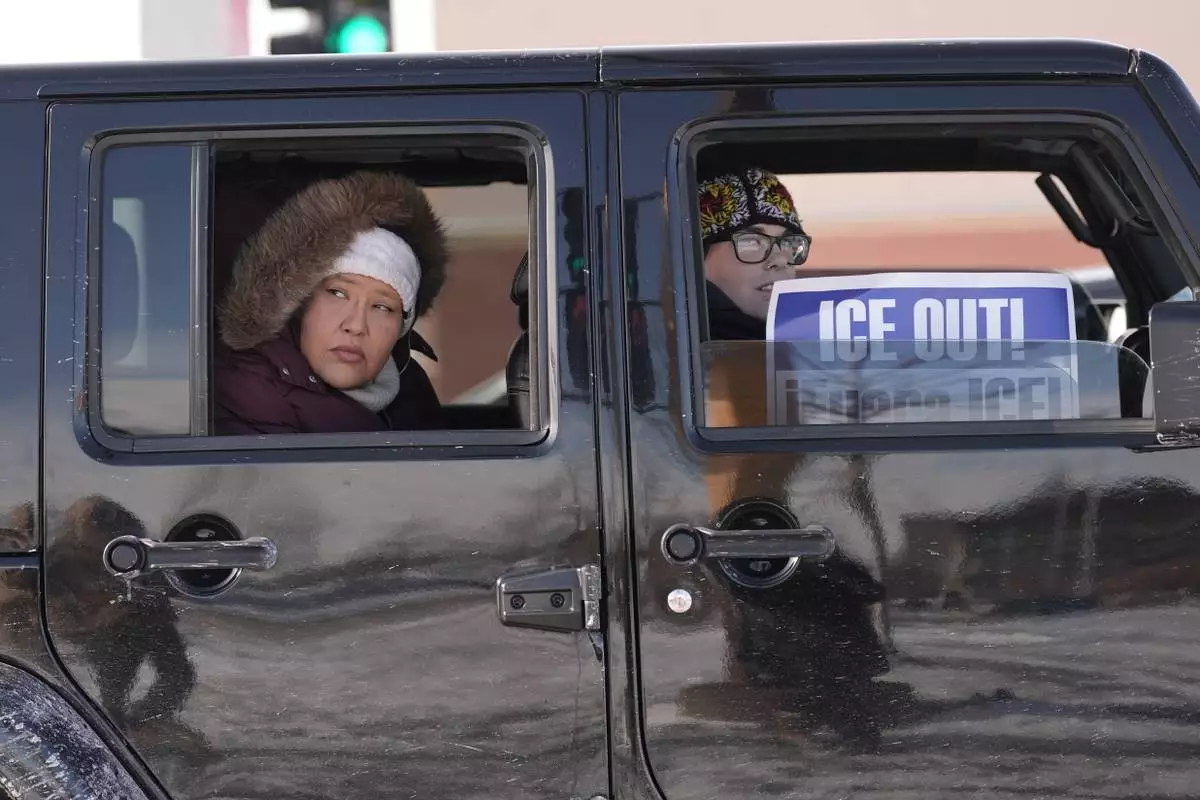 People ride in a car during a caravan protest, Monday, Jan. 19, 2026 in St. Paul, Minn. (AP Photo/Angelina Katsanis)