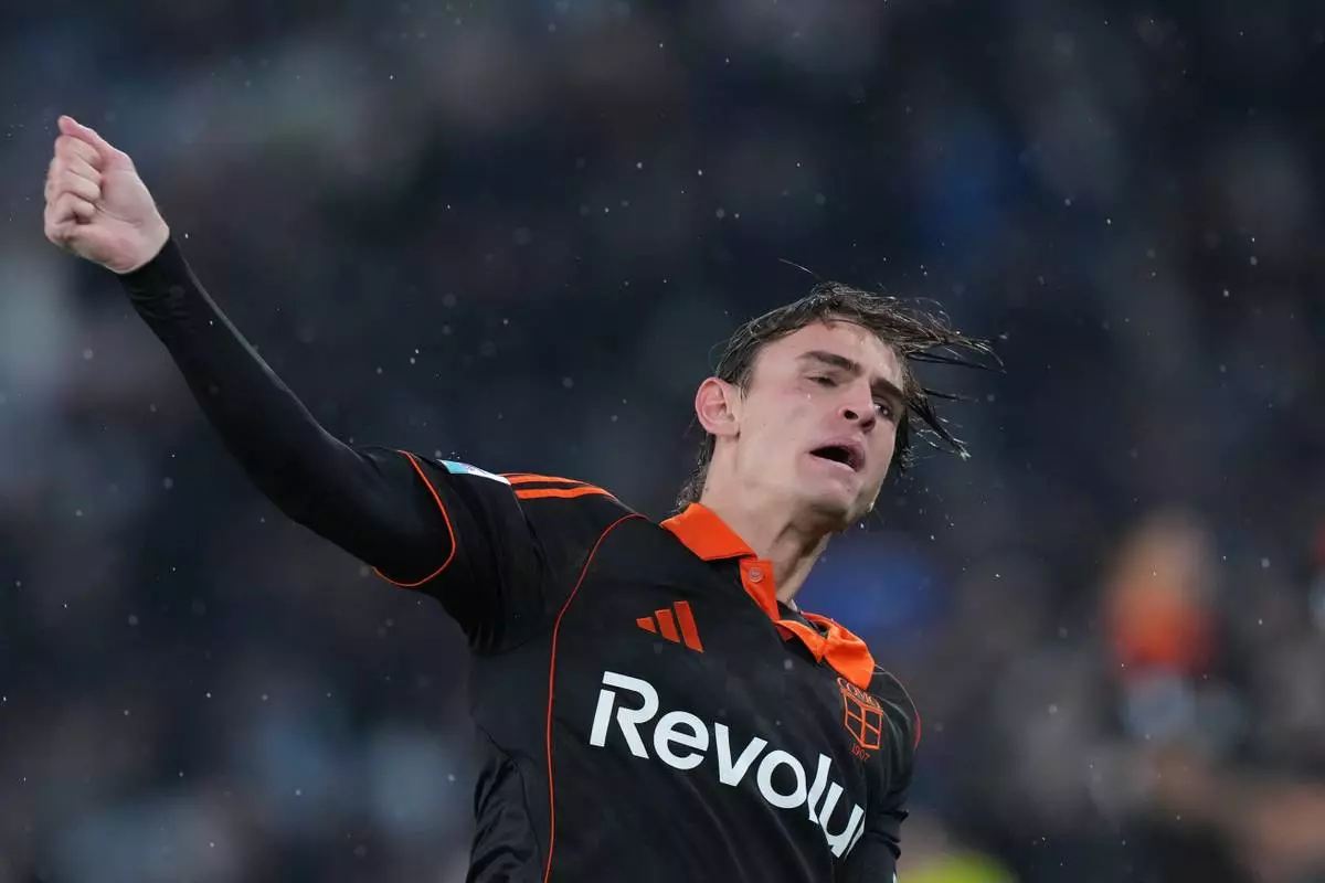 Como's Nico Paz celebrates after scoring his side's third goal during the Serie A soccer match between Lazio and Como, in Rome, Monday, Jan. 19, 2026. 2026. (Alfredo Falcone/LaPresse via AP)