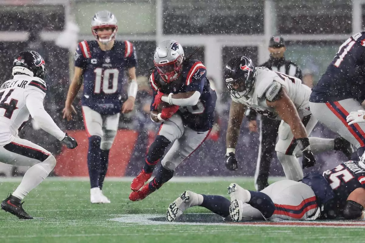 Drake Maye completed 16 of 27 passes for 179 yards and three touchdowns; he also had an interception on an end-of-half desperation pass and fumbled four times, turning it over twice, in a wintry mix that also contributed to the four interceptions thrown by Texans QB C.J. Stroud.