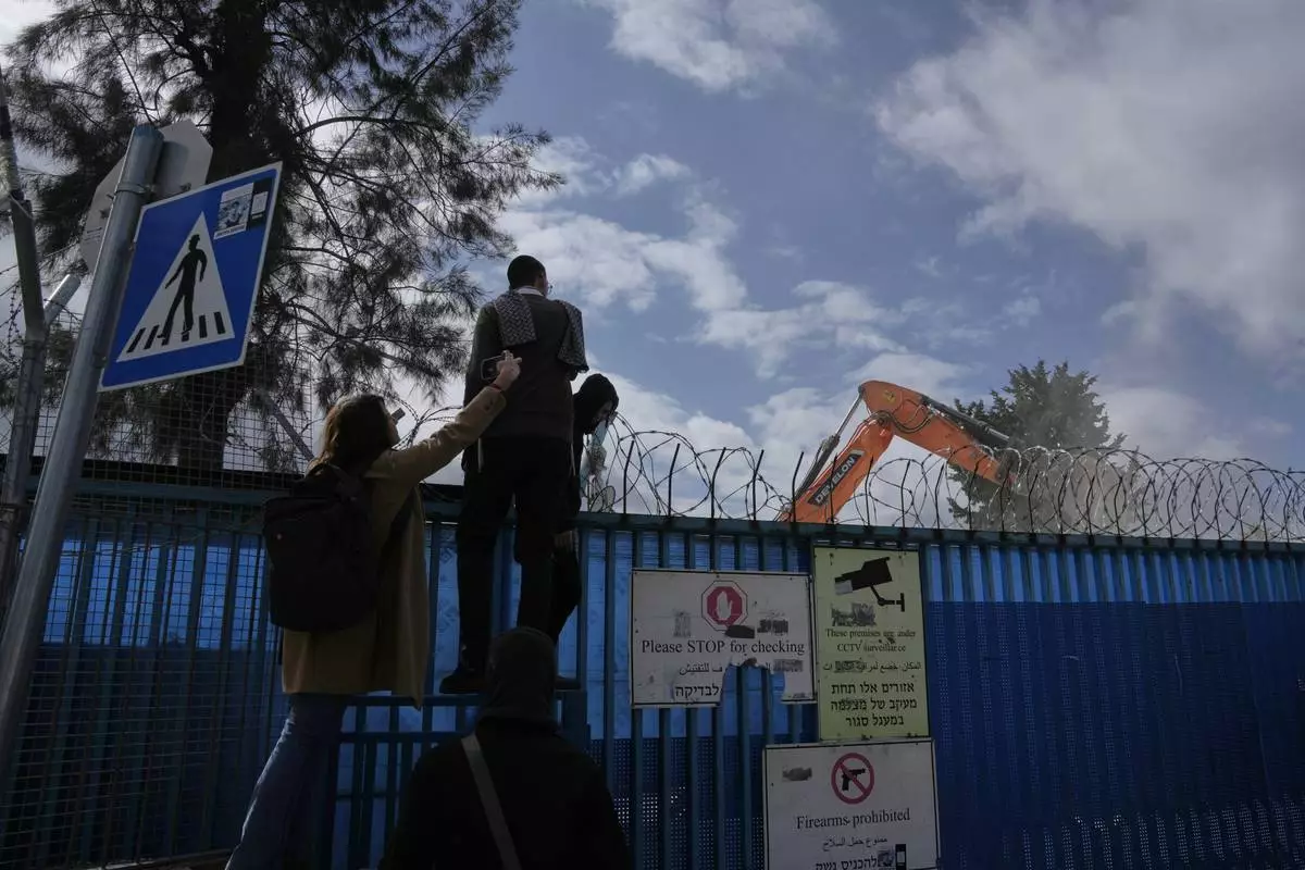 People watch the demolition of a UNRWA compound, the U.N. agency that assists Palestinian refugees, in east Jerusalem Tuesday, Jan. 20, 2026. (AP Photo/Mahmoud Illean)