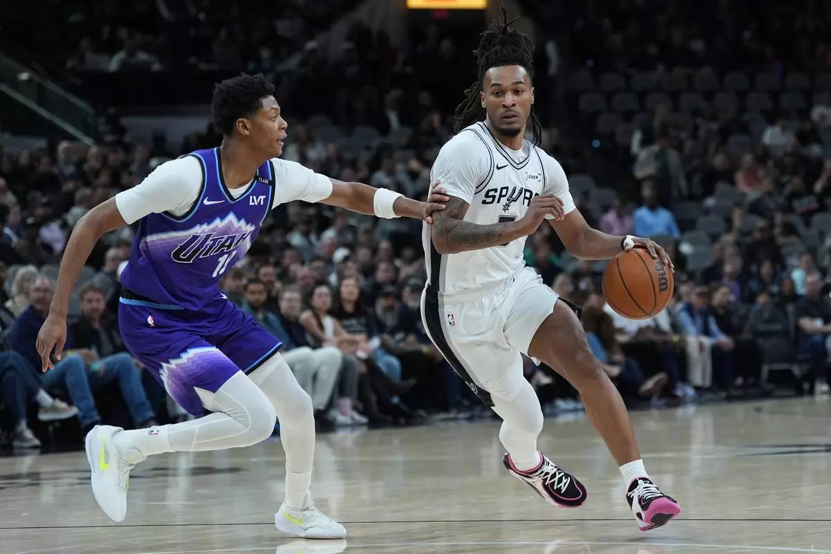 San Antonio Spurs guard Stephon Castle, right, drives against Utah Jazz guard Ace Bailey (19) during the first half of an NBA basketball game in San Antonio, Monday, Jan. 19, 2026. (AP Photo/Eric Gay)