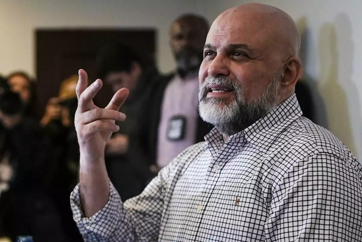 FILE - Colombian former paramilitary leader Salvatore Mancuso arrives to give a press conference in Bogota, Colombia, the day after a court granted him conditional release from prison, July 11, 2024. (AP Photo/Ivan Valencia, File)
