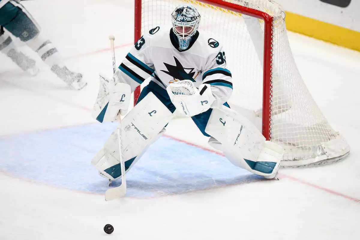 San Jose Sharks goaltender Alex Nedeljkovic (33) watches the puck during the third period of an NHL hockey game against the Washington Capitals, Thursday, Jan. 15, 2026, in Washington. (AP Photo/Nick Wass)