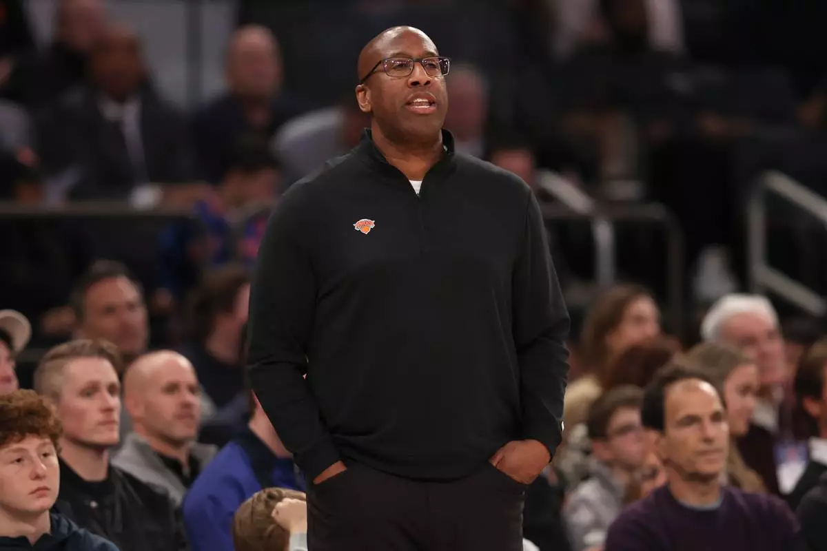 New York Knicks head coach Mike Brown stands on the court during the first half of an NBA basketball game against the Dallas Mavericks, Monday, Jan. 19, 2026, in New York. (AP Photo/Pamela Smith)