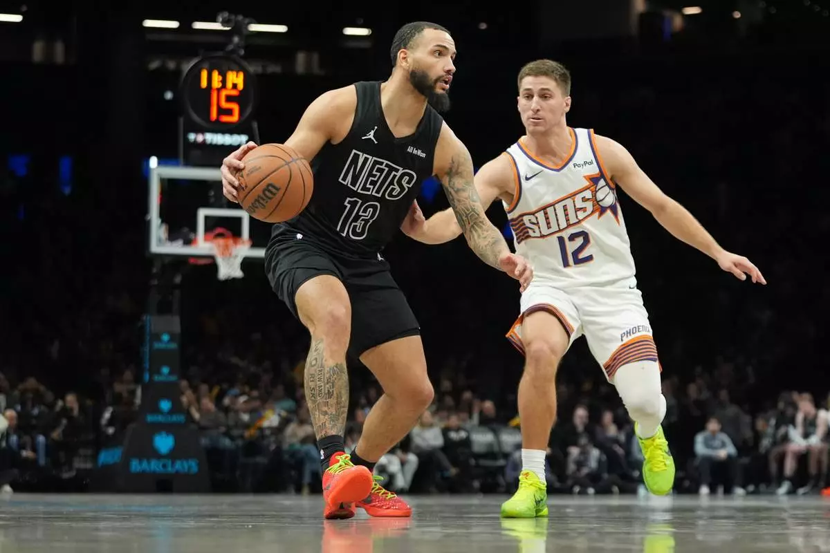 Phoenix Suns' Collin Gillespie (12) defends Brooklyn Nets' Tyrese Martin (13) during the second half of an NBA basketball game Monday, Jan. 19, 2026, in New York. (AP Photo/Frank Franklin II)