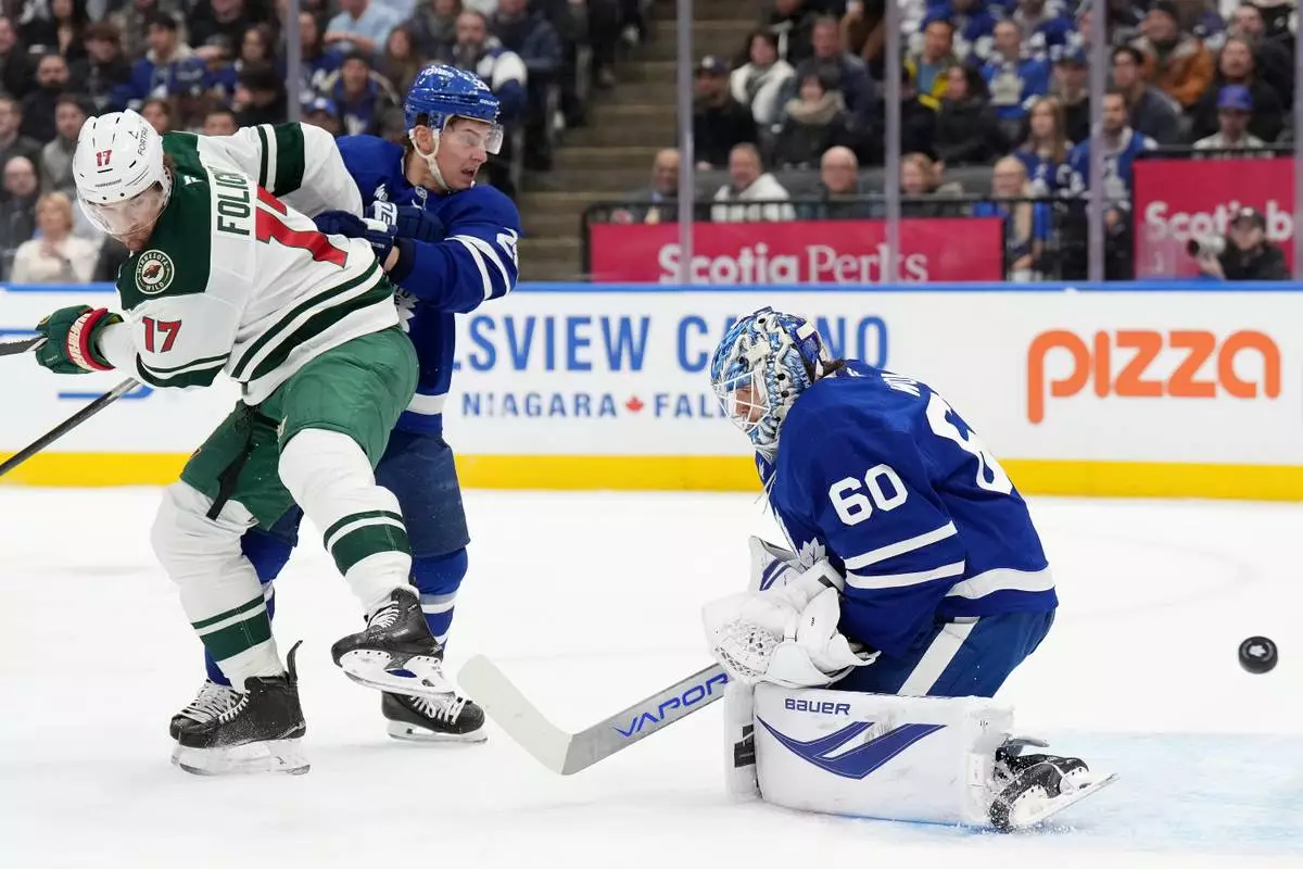 Toronto Maple Leafs goaltender Joseph Woll (60) makes a save on a tip by Minnesota Wild forward Marcus Foligno (17) as Maple Leafs defenseman Troy Stecher, second from left, tries to defend during first-period NHL hockey game action in Toronto, Monday, Jan. 19, 2026. (Nathan Denette/The Canadian Press via AP)