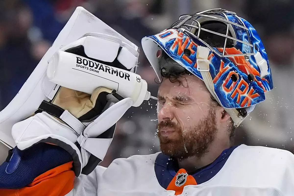 New York Islanders goalie Ilya Sorokin squirts water on his face during a stoppage in play during the third period of an NHL hockey game against the Vancouver Canucks, in Vancouver, B.C., Monday, Jan. 19, 2026. (Darryl Dyck/The Canadian Press via AP)
