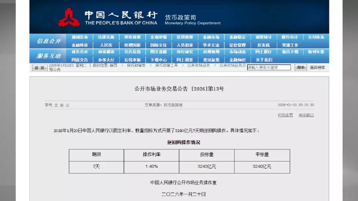 China's central bank conducted 324 billion yuan (about 46.49 billion U.S. dollars) of seven-day reverse repos at an interest rate of 1.4 percent on Tuesday.