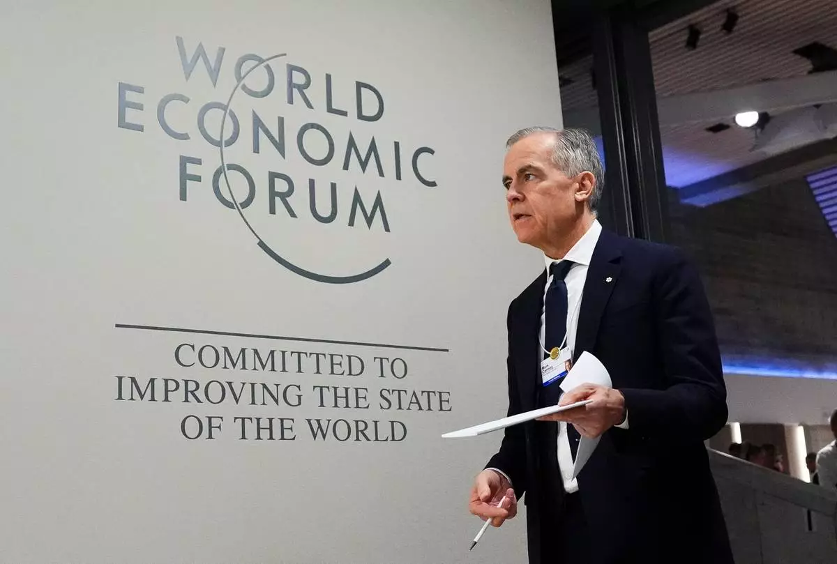 Canada Prime Minister Mark Carney makes his way to take part in an event tilted "Country Strategy Dialogue: Canada" as he attends the World Economic Forum in Davos, Switzerland on Tuesday, Jan. 20, 2026. (Sean Kilpatrick/The Canadian Press via AP)