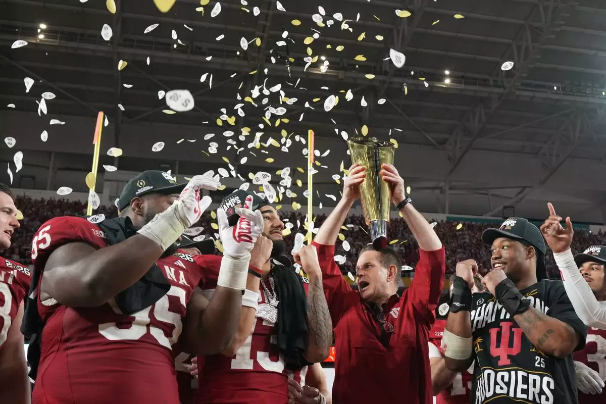 Indiana head coach Curt Cignetti holds the trophy after their win against Miami in the College Football Playoff national championship game, Monday, Jan. 19, 2026, in Miami Gardens, Fla. (AP Photo/Rebecca Blackwell)
