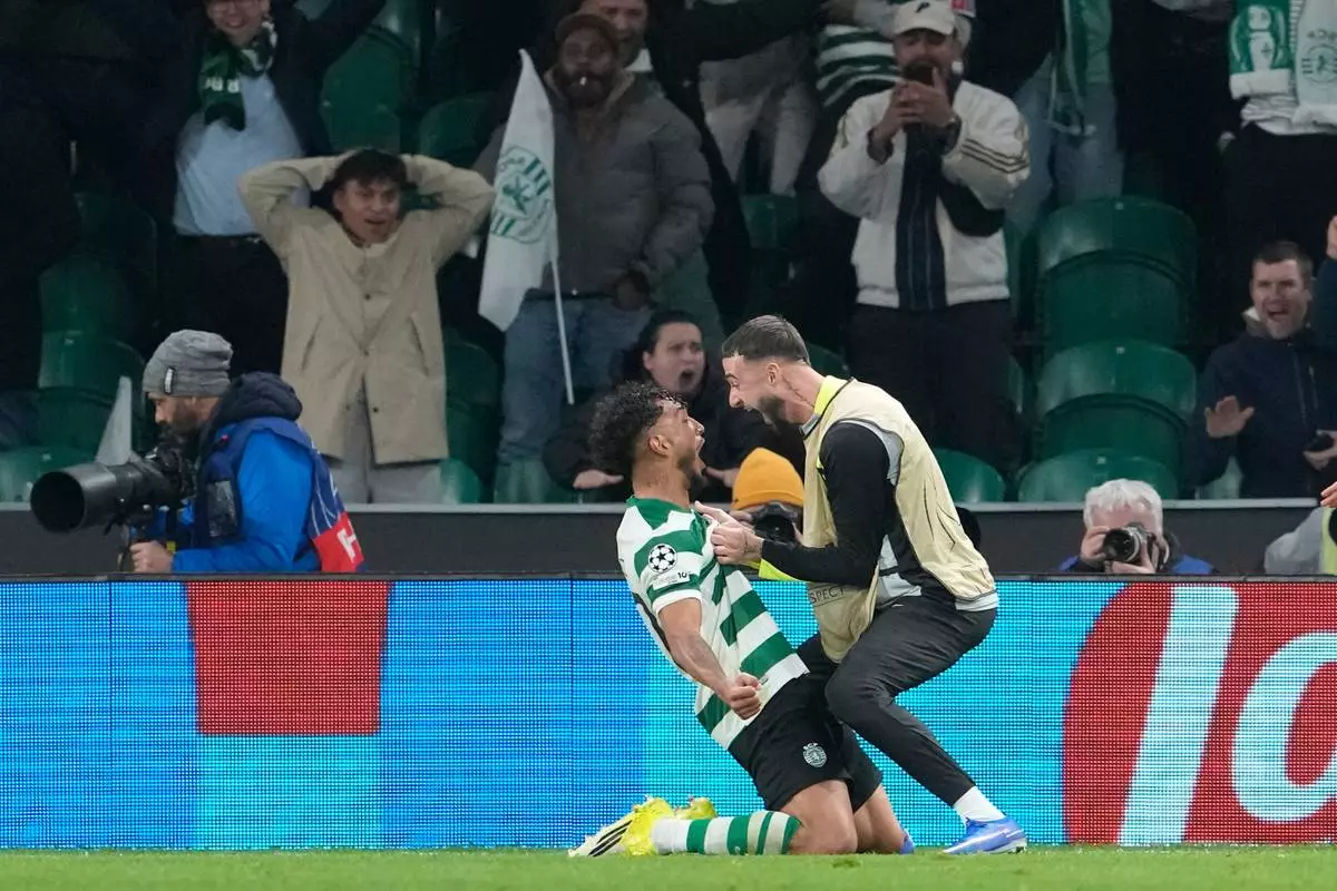 Sporting's Luis Suarez, left, celebrates after scoring his side's second goal during the Champions League opening phase soccer match between Sporting CP and Paris Saint-Germain, in Lisbon, Tuesday, Jan. 20, 2026. (AP Photo/Armando Franca)