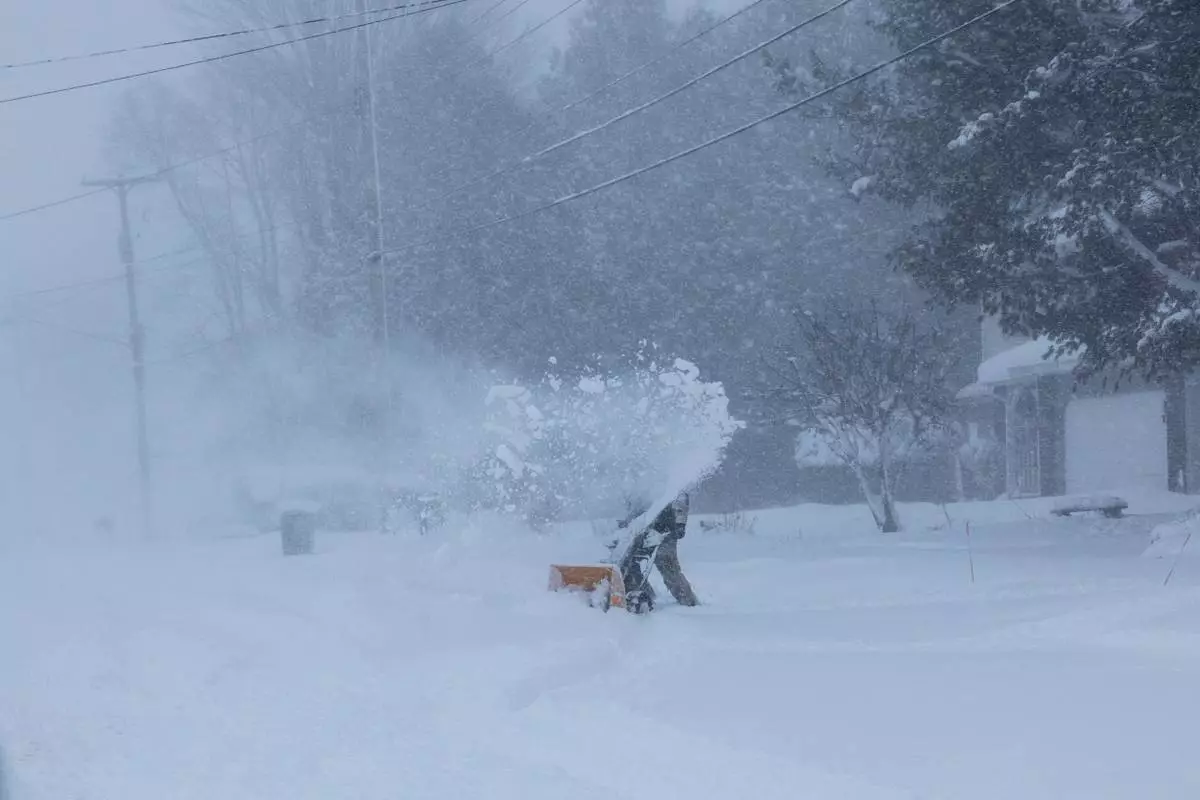 A person clears snow from their driveway during a winter storm warning in Walker, Mich. on Monday, Jan. 19, 2026. (Joel Bissell/Kalamazoo Gazette via AP)