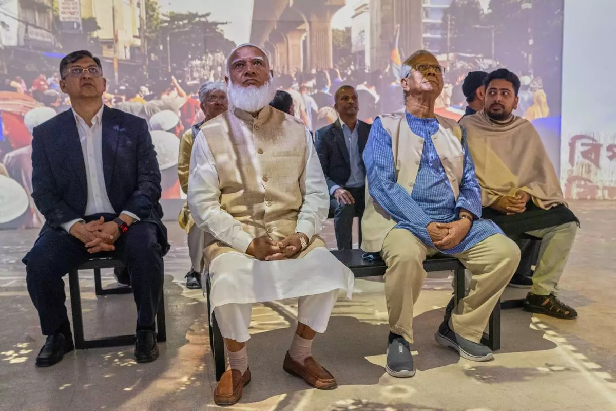 Head of Bangladesh's interim government Muhammad Yunus, second right, with Bangladesh Jamaat-e-Islami party leader Ameer Shafiqur Rahman, second left, watch an audio visual during the inauguration of the July Uprising Memorial Museum, once the official residence of Bangladesh's ousted Prime Minister Sheikh Hasina, in Dhaka, Bangladesh, Tuesday, Jan. 20, 2026. (AP Photo/Mahmud Hossain Opu)