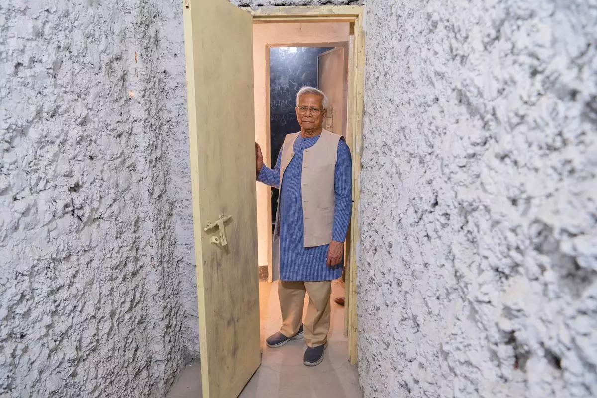Head of Bangladesh's interim government Muhammad Yunus, center, looks at an exhibit during the inauguration of the July Uprising Memorial Museum, once the official residence of Bangladesh's ousted Prime Minister Sheikh Hasina, in Dhaka, Bangladesh, Tuesday, Jan. 20, 2026. (AP Photo/Mahmud Hossain Opu)