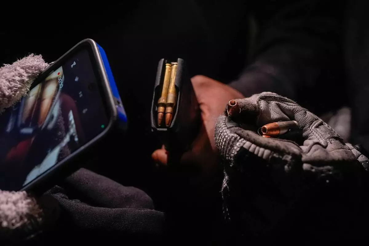 Protesters display two magazines of live ammunition found on the ground after federal immigration officers deployed tear gas and disrupted a demonstration outside the Bishop Whipple Federal Building, Monday, Jan. 12, 2026, in Minneapolis. (AP Photo/Jen Golbeck)