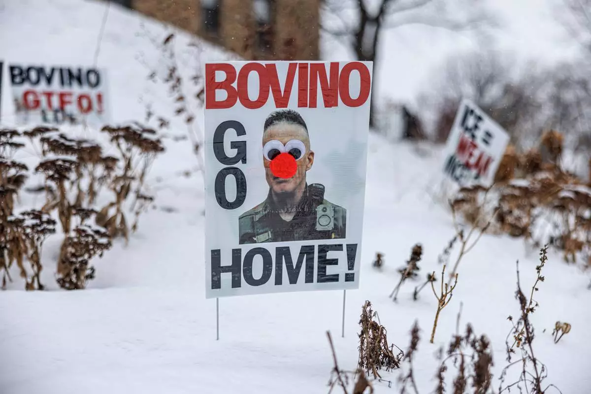 A poster reading "Bovino Go Home," featuring an altered image of U.S. Border Patrol Cmdr. Gregory Bovino, is displayed in the snow outside a home on Wednesday, Jan. 21, 2026, in Minneapolis. (Kerem Yücel/Minnesota Public Radio via AP)