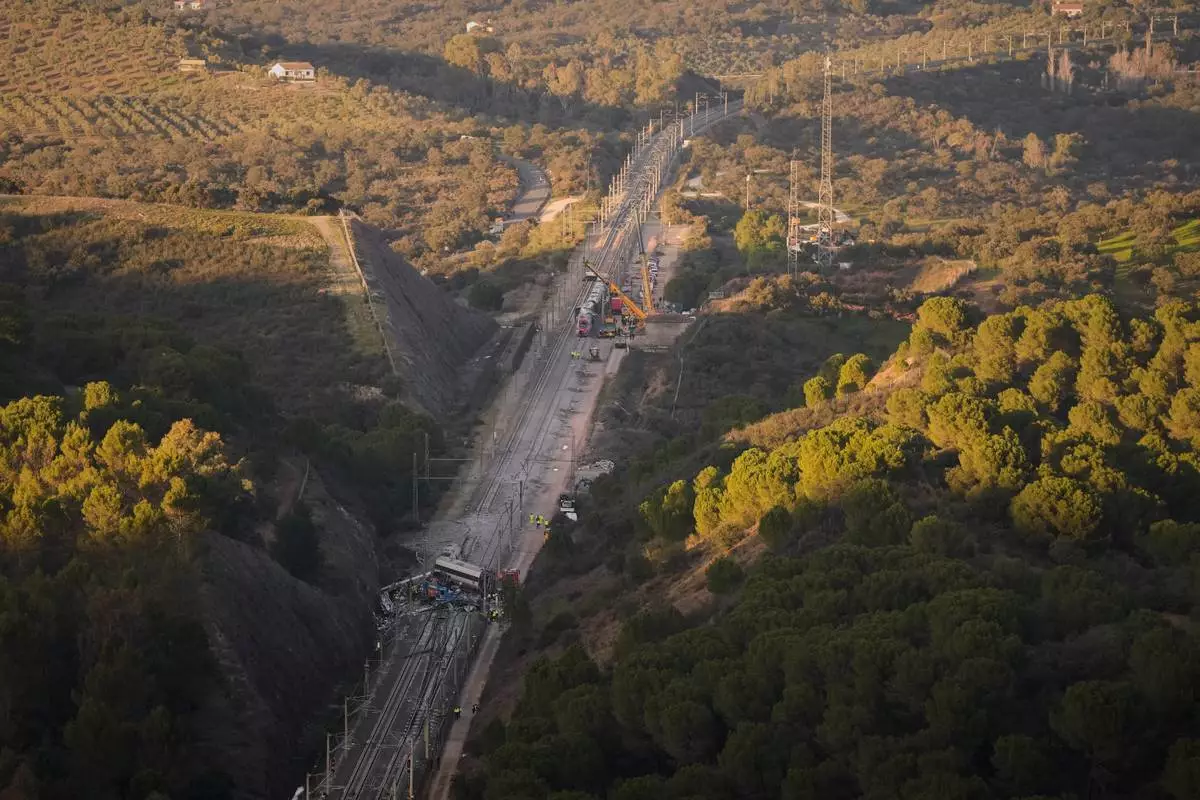 View of the site of a train collision in Adamuz, southern Spain, Tuesday, Jan. 20, 2026. (AP Photo/Manu Fernandez)