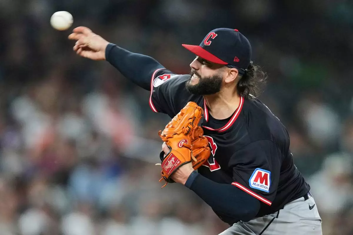 FILE - Cleveland Guardians pitcher Jakob Junis throws against the Detroit Tigers during the eighth inning of a baseball game, Sept. 17, 2025, in Detroit. (AP Photo/Paul Sancya, File)