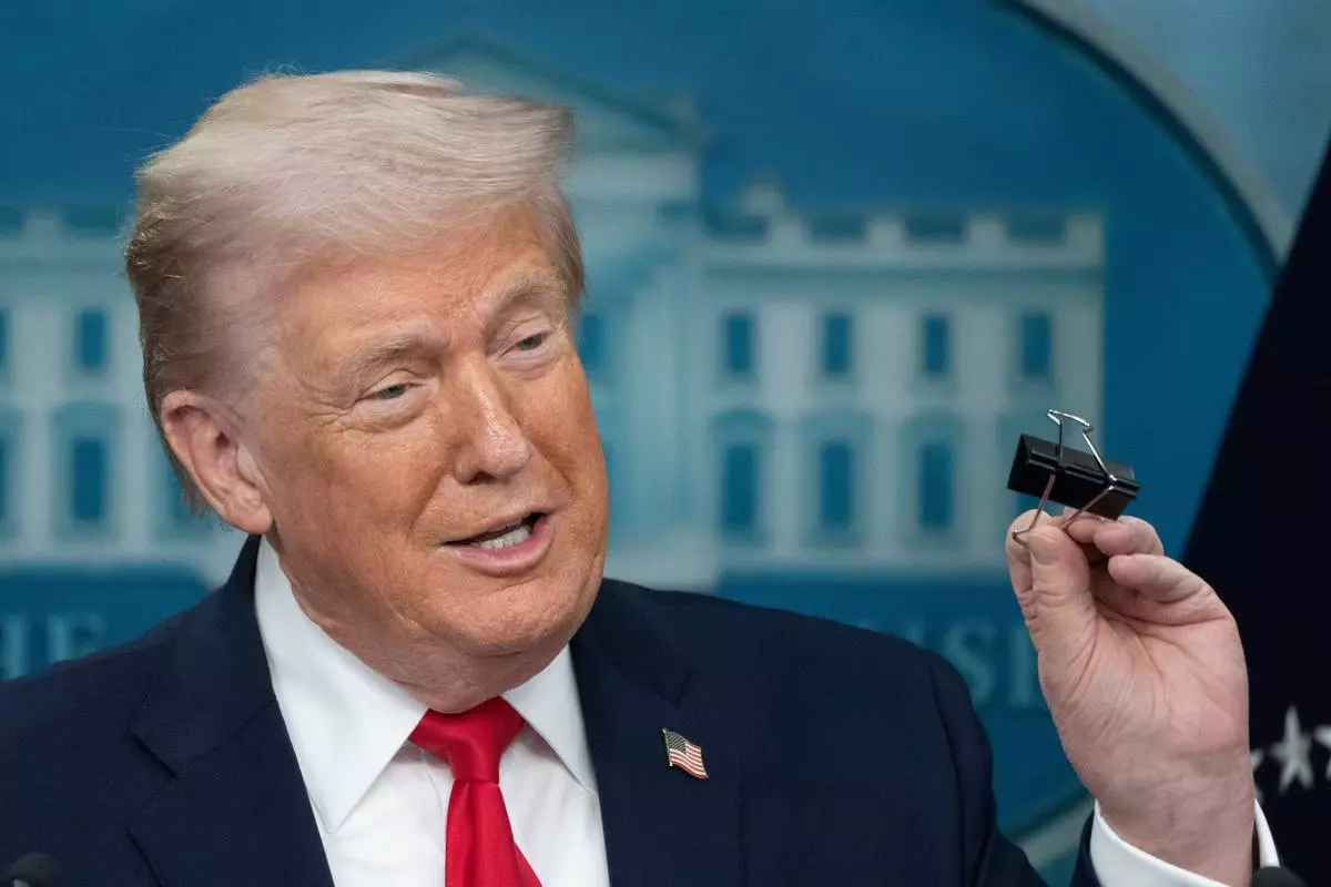 President Donald Trump holds a binder clip as he speaks during a press briefing at the White House in Washington, Tuesday, Jan. 20, 2026. (AP Photo/Mark Schiefelbein)