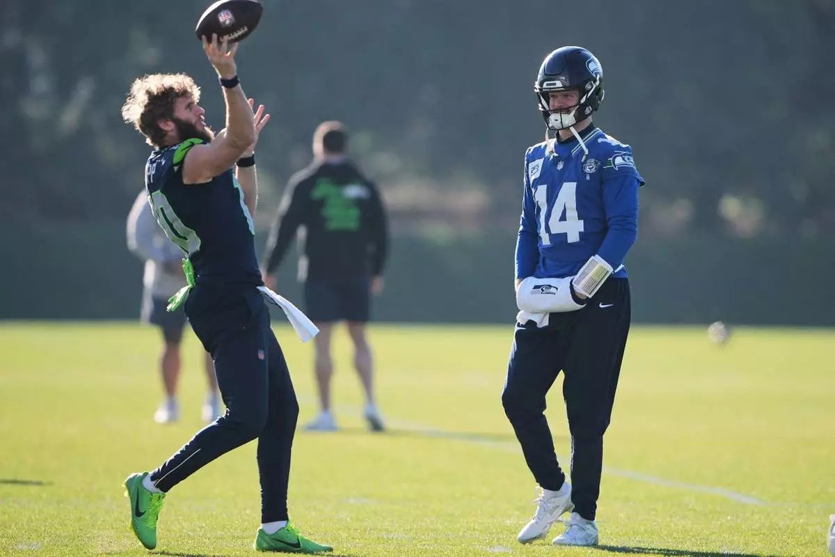 Seattle Seahawks quarterback Sam Darnold (14) watches wide receiver Cooper Kupp (10) throw during practice at the team's facilities ahead of the NFL football NFC Championship game, Wednesday, Jan. 21, 2026, in Renton, Wash. (AP Photo/Lindsey Wasson)