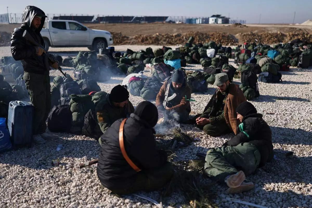 Syrian government soldiers light a small fire as they wait to enter the al-Hol camp in northeastern Syria's Hasakeh province, Syria, Wednesday, Jan. 21, 2026, after the withdrawal of the Syrian Democratic Forces (SDF). (AP Photo/Ghaith Alsayed)