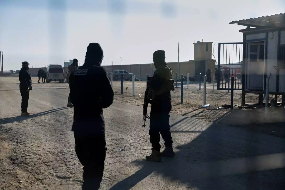 Syrian government troops stand guard at the entrance to the al-Hol camp in northeastern Syria's Hasakeh province, Syria, Wednesday, Jan. 21, 2026, after the withdrawal of the Syrian Democratic Forces (SDF). (AP Photo/Ghaith Alsayed)