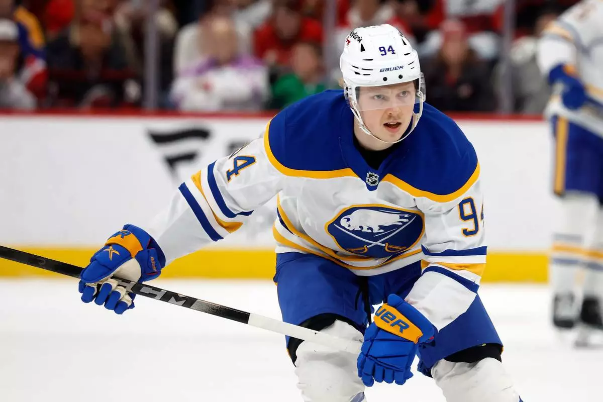 Buffalo Sabres' Konsta Helenius skates after the puck during the third period of an NHL hockey game against the Carolina Hurricanes in Raleigh, N.C., Monday, Jan. 19, 2026. (AP Photo/Karl DeBlaker)