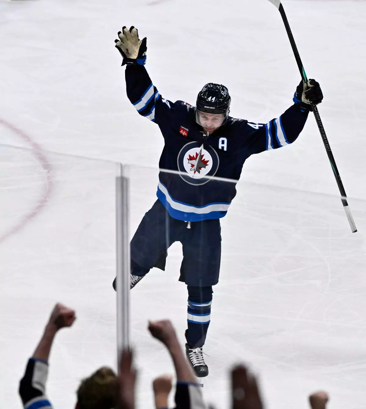 Winnipeg Jets' Josh Morrissey (44) celebrates his goal against the St. Louis Blues during the first period of an NHL hockey game in Winnipeg, Tuesday Jan. 20, 2026. (Fred Greenslade/The Canadian Press via AP)