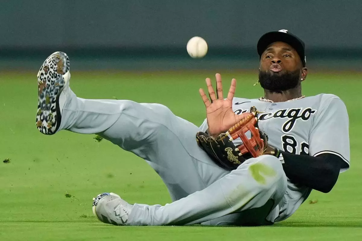 FILE -Chicago White Sox center fielder Luis Robert Jr. catches a fly ball for the out on Kansas City Royals' Mike Yastrzemski during the seventh inning of a baseball game, Aug. 15, 2025, in Kansas City, Mo. (AP Photo/Charlie Riedel), File)
