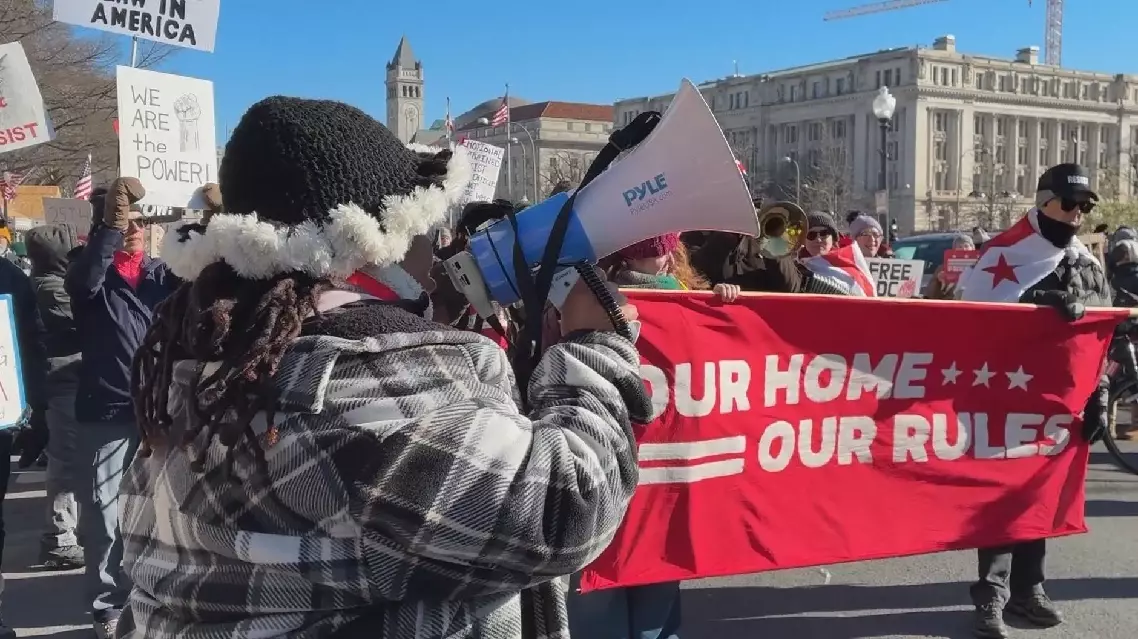 In Washington, D.C., around 1,000 protesters gathered outside the White House to voice concerns over U.S. domestic and foreign policies, with recent actions involving Greenland and Venezuela among the key issues.