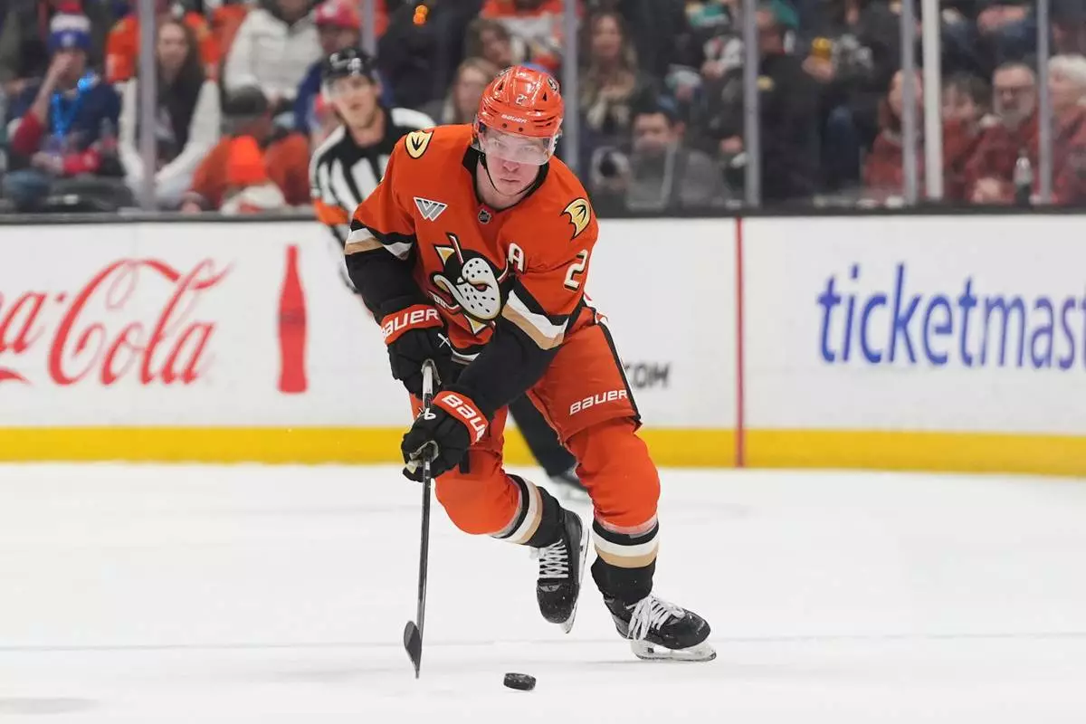 Anaheim Ducks defenseman Jackson LaCombe brings the puck up the ice during the first period of an NHL hockey game against the New York Rangers Monday, Jan. 19, 2026, in Anaheim, Calif. (AP Photo/Gregory Bull)