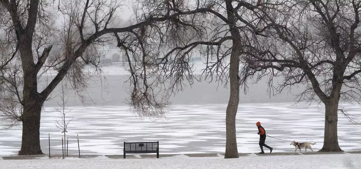 A runner and his dog circle a frozen Prospect Lake in Colorado Springs, Colo., Friday, Jan. 23, 2026, as snow and extremely cold weather hits the Pikes Peak Region. (Christian Murdock/The Gazette via AP)